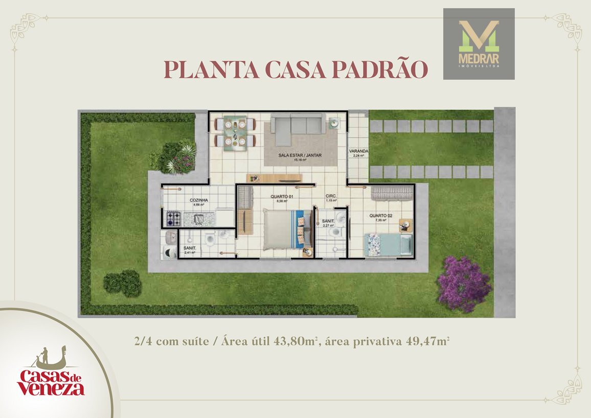 Casasde 2 quartos (suíte) noPapagaio.A Estação 1 e a F.Souza Construções, com planejamento da R.Carvalho, apresentam oCasas de Veneza.Área privativa das casas: 49,47m²